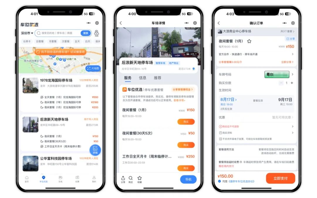 停車需求會因為業(yè)態(tài)存在明顯的潮汐效應,如寫字樓白天滿晚上空,景區(qū)節(jié)假日繁忙工作日空閑等等,大浪街道及捷停車運營經理經實地走訪后,以不同業(yè)態(tài)進行互補,設計包括日卡、次卡、分時月卡、全天月卡等豐富的停車套餐,通過“龍華智慧停車”小程序以及“捷停車·車位優(yōu)選”的平臺服務,及時準確地將共享停車車場、套餐等信息進行線上發(fā)布。