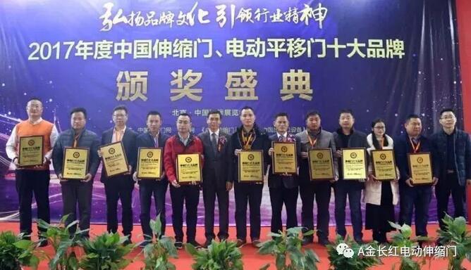 2018,狗年開(kāi)門(mén)紅!陽(yáng)春三月,金長(zhǎng)紅門(mén)業(yè)也是一個(gè)收獲滿(mǎn)滿(mǎn)的季節(jié)。3月9日,金長(zhǎng)紅門(mén)業(yè)應(yīng)邀參加第一屆中國(guó)(北京)電動(dòng)圍墻門(mén)科技成果發(fā)布會(huì)暨2017年度中國(guó)伸縮門(mén)、電動(dòng)平移門(mén)十大品牌頒獎(jiǎng)盛典。金長(zhǎng)紅門(mén)業(yè)斬獲“伸縮門(mén)十大品牌”這一殊榮,為金長(zhǎng)紅的春天增添了一道亮麗的風(fēng)景線!