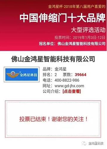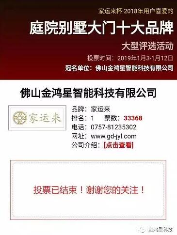 齊心協(xié)力,開拓創(chuàng)新。自“金鴻星杯·2018第八屆用戶喜愛的中國伸縮門十大品牌”大型評選活動開啟以來,金鴻星智能科技有限公司就受到業(yè)內(nèi)外人士的廣泛支持, 并再次蟬聯(lián)全國伸縮門網(wǎng)十大品牌評選前三甲,收獲“伸縮門十大品牌”排名第二、“電動平移門十大品牌”排名第一,金鴻星旗下家運來“庭院別墅門十大品牌“排名第一的多項榮譽,在此感謝金鴻星家人辛勤付出,感謝各界人士對金鴻星及家運來的支持與厚愛,榮耀只是過去,未來更加可期!