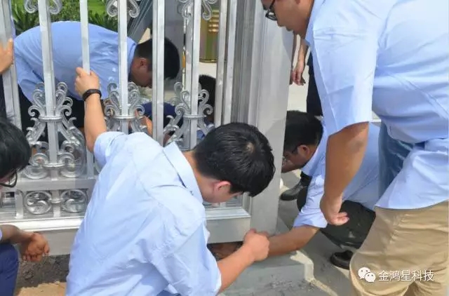 5月30日,培訓(xùn)的第二天,也是傳統(tǒng)的端午節(jié),即便是過節(jié),也抵擋不住金鴻星伸縮門業(yè)家人對學(xué)習(xí)的激情,頂著火辣辣的太陽進行實地安裝操作,渾身濕透,也干勁十足。