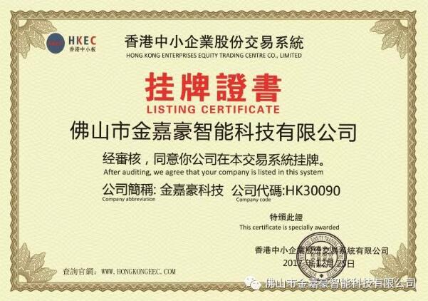 2017年12月25日,雙旦來臨之際,喜上加喜!在世界金融中心香港,佛山市金嘉豪智能科技有限公司成功掛牌全球中小企業(yè)股權(quán)交易中心(企業(yè)代碼HK30090),開啟了邁向國(guó)內(nèi)外更高層次資本市場(chǎng)的航程。