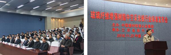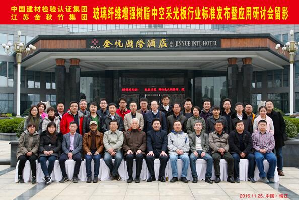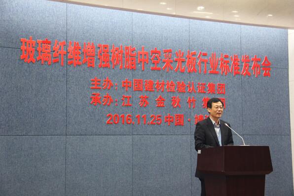 2016年11月25日上午9時,由中國建材檢驗認(rèn)證集團和江蘇金秋竹集團聯(lián)合主編的“GRP高強中空采光板行業(yè)標(biāo)準(zhǔn)”在市政府3#報告廳隆重發(fā)布,來自清華大學(xué)生態(tài)規(guī)劃與綠色建筑設(shè)計研究所、北京新型材料建筑設(shè)計研究院、天津市建筑設(shè)計院以及軍隊、航空等建筑設(shè)計單位的50多名專家學(xué)者應(yīng)邀出席,發(fā)布會由中國建材檢驗認(rèn)證集團主任蔣荃主持。