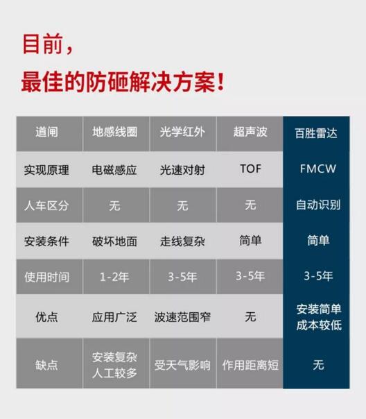 百勝防砸雷達能精確識別區(qū)分人、車,區(qū)分直桿、柵欄桿,避免“砸車”、 “砸人”、“不落桿”等現(xiàn)象。