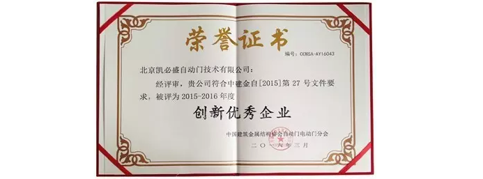 榮譽(yù)是一種獎賞,是給追求夢想全力以赴的凱必盛人的高度肯定,同時榮譽(yù)更是一種激勵。新年伊始,手握“2015-2016年度創(chuàng)新優(yōu)秀企業(yè)”等三項殊榮的沉甸甸的獎狀,凱必盛感謝協(xié)會及行業(yè)同仁的認(rèn)可與肯定。而未來的凱必盛將繼續(xù)在技術(shù)革新、服務(wù)管理等方面深度優(yōu)化,與協(xié)會攜手助力中國自動門行業(yè)飛躍式發(fā)展!
