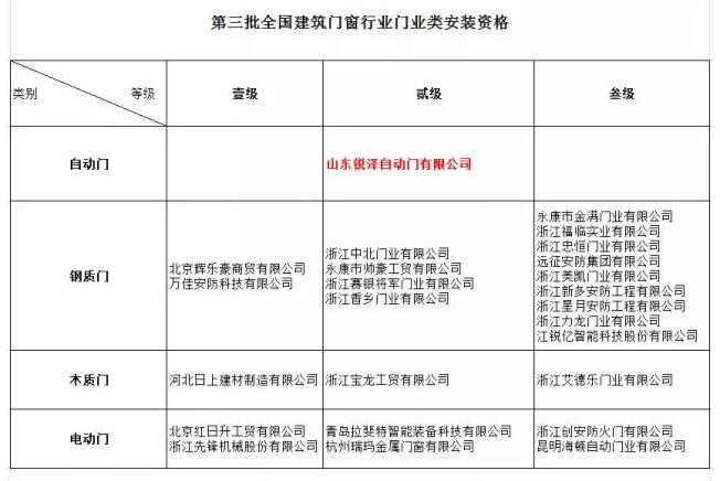在國務(wù)院及相關(guān)部委轉(zhuǎn)變政府職能,相繼撤銷建筑門窗行業(yè)帶有行政許可性質(zhì)的生產(chǎn)、安裝資質(zhì)后,為加強(qiáng)行業(yè)自律,客觀評(píng)價(jià)企業(yè)制造能力和安裝水平,中國建筑金屬結(jié)構(gòu)協(xié)會(huì)聯(lián)合全國30多個(gè)省市協(xié)會(huì)共同開展了“建筑門窗行業(yè)企業(yè)資格登記”的工作,制訂了嚴(yán)格的等級(jí)標(biāo)準(zhǔn)和評(píng)審流程,并編寫了各類門和窗的培訓(xùn)教材。本次評(píng)選根據(jù)《建筑門窗企業(yè)行業(yè)資格管理辦法》、門類相關(guān)等級(jí)標(biāo)準(zhǔn)和資格管理實(shí)施細(xì)則,經(jīng)企業(yè)申報(bào)、專家評(píng)審、網(wǎng)上公示,資格管理辦公室確認(rèn),第三批全國建筑門窗行業(yè)門業(yè)類制造資格共17項(xiàng),安裝資格共25項(xiàng)。以下是獲得證書的企業(yè)名單如下: