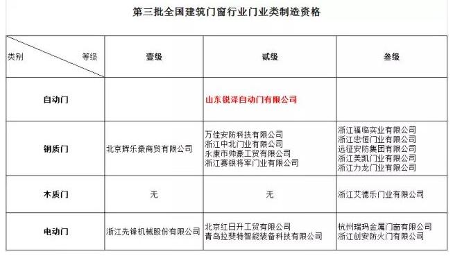 9月18日,第三屆中國西部門窗博覽會(huì)在成都世紀(jì)城新國際會(huì)展中心開幕,同期召開“2016年中國西部門業(yè)發(fā)展高峰論壇”并頒發(fā)第三批通過建筑門窗企業(yè)行業(yè)資格登記證書,其中山東銳澤榮獲自動(dòng)門類制造及安裝兩項(xiàng)行業(yè)二級(jí)企業(yè)資格證書,同時(shí)也是本批次唯一入選的自動(dòng)門生產(chǎn)、安裝企業(yè)。