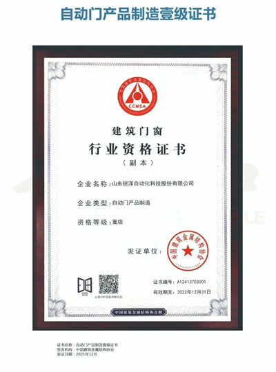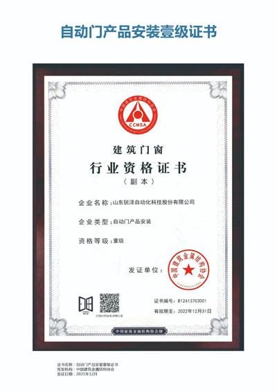 守匠于心,精進于行,二十年潛心積淀,銳澤正一步一個腳印發(fā)展壯大。自動門產(chǎn)品制造、安裝雙壹級資質的取得,既是肯定和認可,同時也是激勵與鞭策。未來,我們將不斷研發(fā)創(chuàng)新,深化服務,延伸品牌影響力,推進企業(yè)實現(xiàn)更大的發(fā)展!