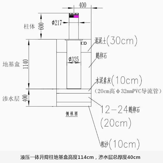 本次液壓一體升降柱安裝案例,采用滲水層自然滲水方式排水。