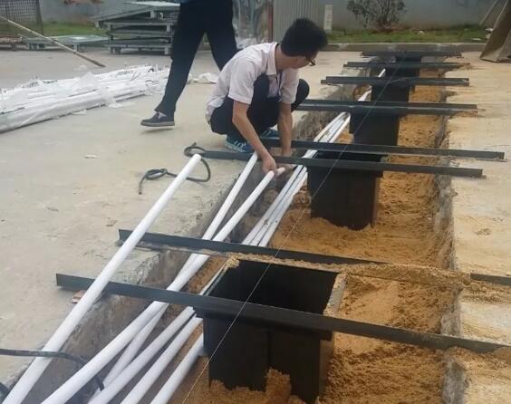 角鋼固定地基盒,地基盒放入預(yù)埋位置,間隔1.2米-1.5米(根據(jù)客戶要求)。