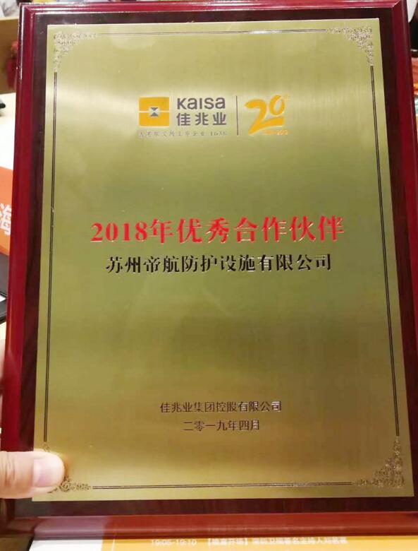 蘇州帝航在此次峰會受到佳兆業(yè)集團(tuán)的高度評價(jià),榮獲“2018年度優(yōu)秀合作伙伴”。