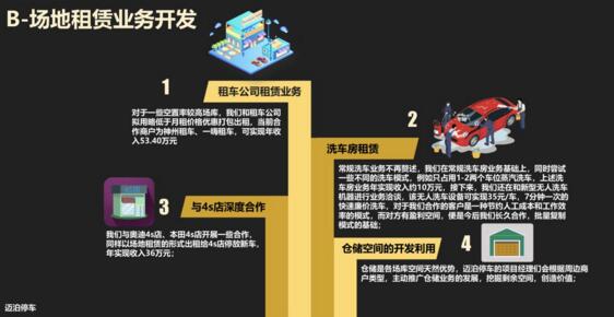 商業(yè)服務(wù)開(kāi)發(fā)專題分享了利用空間資源開(kāi)發(fā)增值業(yè)務(wù)和利用流量資源開(kāi)發(fā)增值商業(yè)兩大部分內(nèi)容。目前在運(yùn)營(yíng)停車場(chǎng)利用空間資源開(kāi)發(fā)增值業(yè)務(wù)已為公司創(chuàng)收利潤(rùn)300萬(wàn)以上。在不斷創(chuàng)新空間資源開(kāi)發(fā)的基礎(chǔ)上,團(tuán)隊(duì)還探索創(chuàng)新了利用流量資源開(kāi)發(fā)增值商業(yè)的新模式。