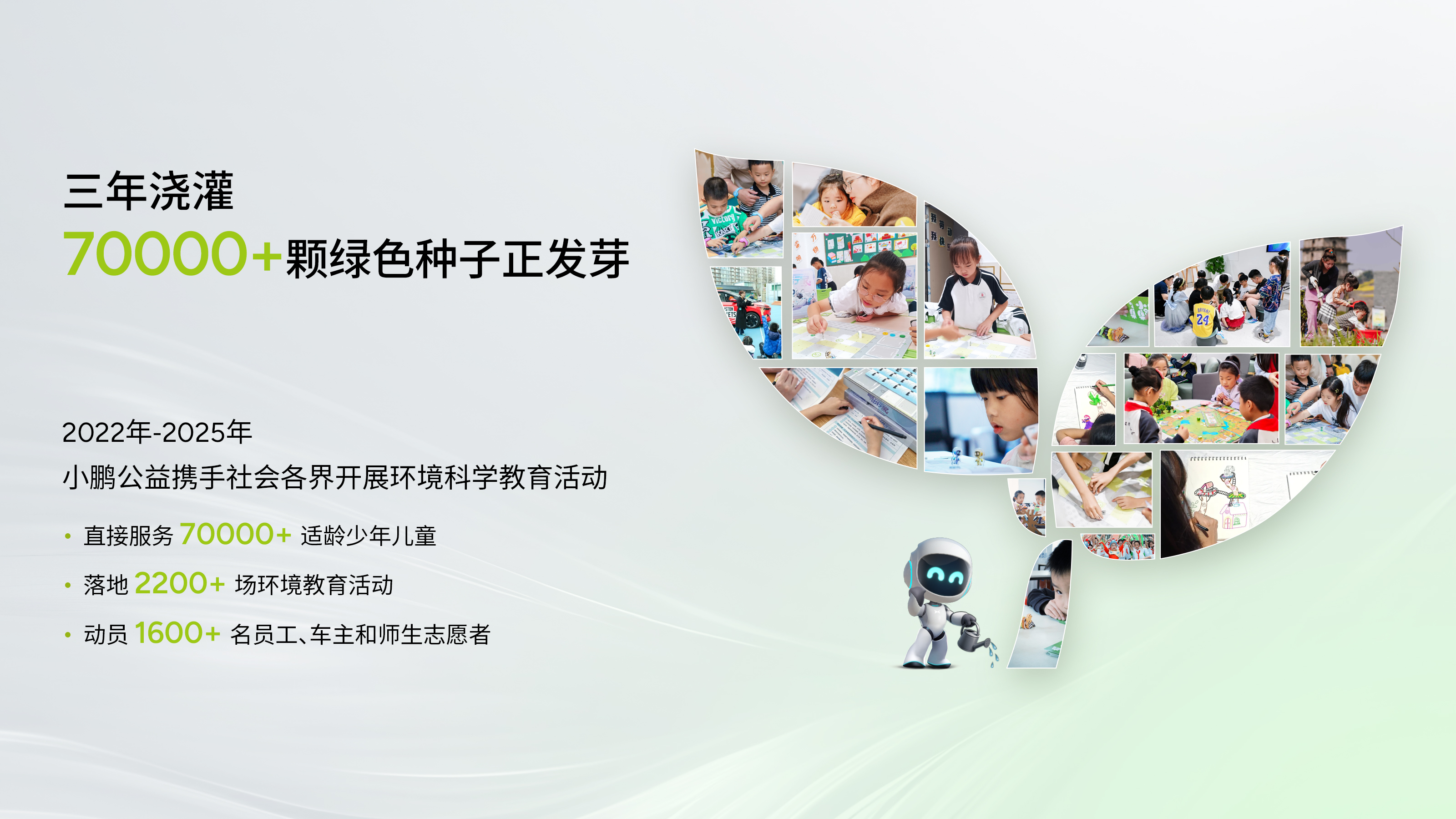 2021年10月,小鵬汽車捐資成立了行業(yè)首個(gè)聚焦生態(tài)環(huán)境議題的小鵬公益基金會(huì);2022年6月5日,小鵬公益正式啟動(dòng)“小鵬綠色家園”環(huán)境科學(xué)教育項(xiàng)目,旨在面向3-15歲兒童及其父母有效傳播氣候變化、能源變革和生物多樣性保護(hù)等生態(tài)環(huán)境最新知識(shí),以提升該目標(biāo)群體對(duì)生態(tài)環(huán)境問題的關(guān)注,增進(jìn)其理解和適應(yīng)生態(tài)環(huán)境變化的能力;該項(xiàng)目陸續(xù)推出「大象要回家」「小鳥集合啦」「低碳出行家」等多個(gè)主題環(huán)境科學(xué)教育課程和教具產(chǎn)品、連續(xù)4年發(fā)布“生態(tài)童書60”書單,動(dòng)員超過1600名員工、車主和師生志愿者,聯(lián)合向善伙伴、公益機(jī)構(gòu)等助力環(huán)境科學(xué)教育事業(yè)。截至目前,該項(xiàng)目已累計(jì)支持學(xué)校、公益組織等開展2200多場環(huán)境教育活動(dòng),平均每天都有2場活動(dòng)開展,覆蓋小鵬汽車門店、中小學(xué)校和城鄉(xiāng)社區(qū)等場景,直接服務(wù)適齡少年兒童超70000人,有效提升了目標(biāo)群體對(duì)氣候變化、生物多樣性等議題的認(rèn)知與行動(dòng)意愿。