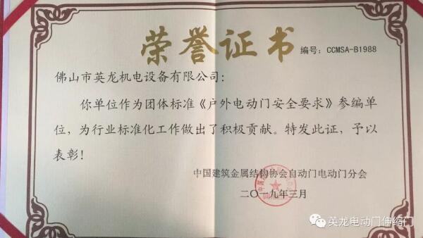 本次獲得的《戶外電動門安全要求》參編單位榮譽,既是協(xié)會領導及各界對佛山英龍公司的肯定,更是對英龍公司的鼓舞和鞭策,同時這份榮譽也承載著行業(yè)及消費者對英龍公司更高的期望。