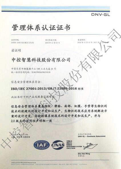 東莞中控智慧建立并實(shí)施的信息安全管理體系順利通過DET NORSKE VERITAS 挪威船級社的認(rèn)證審核,取得了信息安全管理體系認(rèn)證證書。