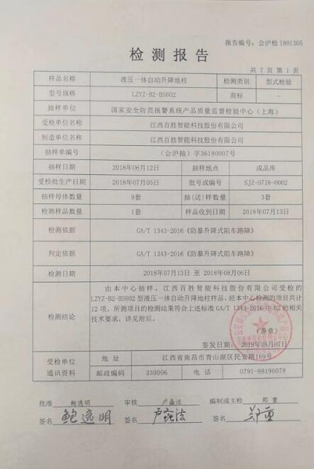 近日,公安部第三研究所的國(guó)家安全防范報(bào)警系統(tǒng)產(chǎn)品質(zhì)量檢測(cè)監(jiān)督中心(上海)、公安部安全防范報(bào)警系統(tǒng)產(chǎn)品質(zhì)量監(jiān)督檢驗(yàn)測(cè)試中心,參照公安部GA/T1343-2106 《防爆升降式阻車(chē)路障》,對(duì)百勝液壓一體自動(dòng)升降地柱進(jìn)行了檢驗(yàn)。