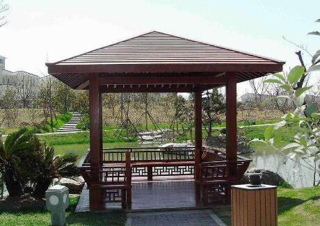 中國(guó)建筑是木結(jié)構(gòu)體系的建筑,所以涼亭也大多是木結(jié)構(gòu)的。木構(gòu)的涼亭,以木構(gòu)架琉璃瓦頂和木構(gòu)黛瓦頂兩種形式最為常見(jiàn)。前者為皇家建筑和壇廟宗教建筑中所特有,富麗堂皇,色彩濃艷。而后者則是中國(guó)古典亭榭的主導(dǎo),或質(zhì)樸莊重,或典雅清逸,遍及大江南北,是中國(guó)古典涼亭的代表形式。此外,木結(jié)構(gòu)的涼亭,也有做成片石頂、鐵皮頂和灰土頂?shù)?,不過(guò)一般比較少見(jiàn),屬于較為特殊的形制。